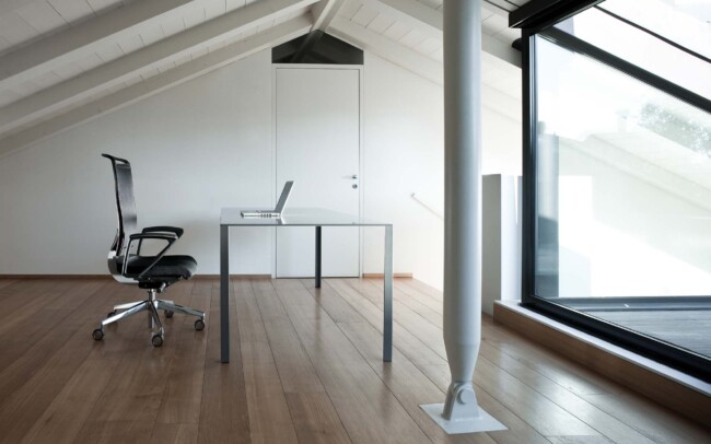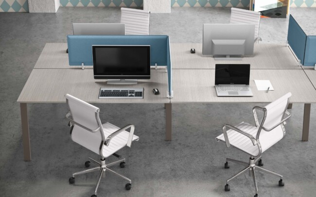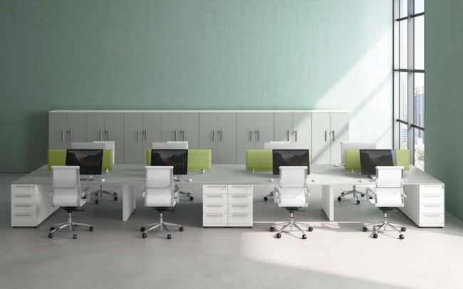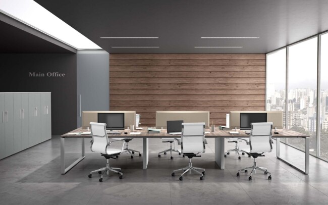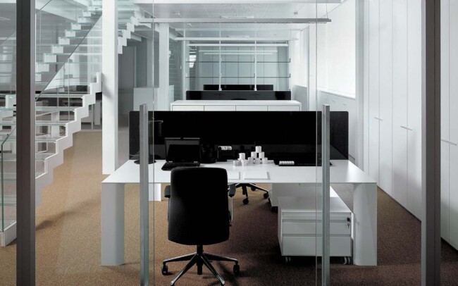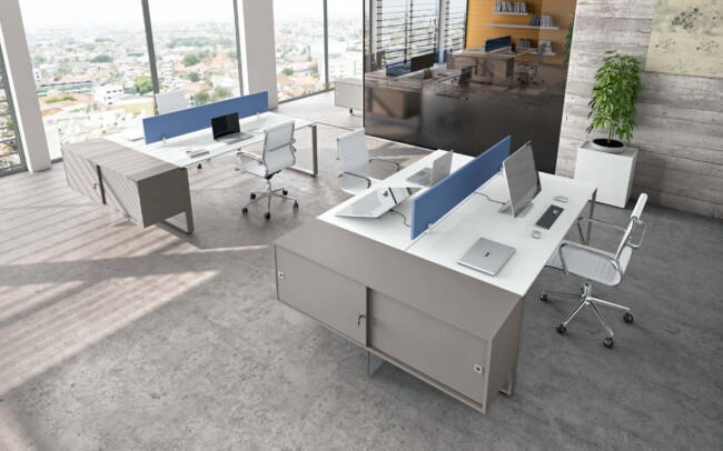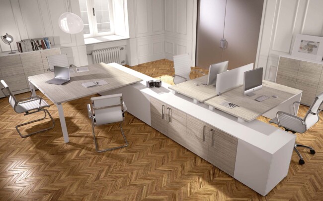 Desks, chairs, partitions and equipped walls, window stickers, plasterboard walls and false ceiling, raised floor and PVC floor, archive, home office, coat hangers and baskets, sound absorbing panels, curtains, air purifier.