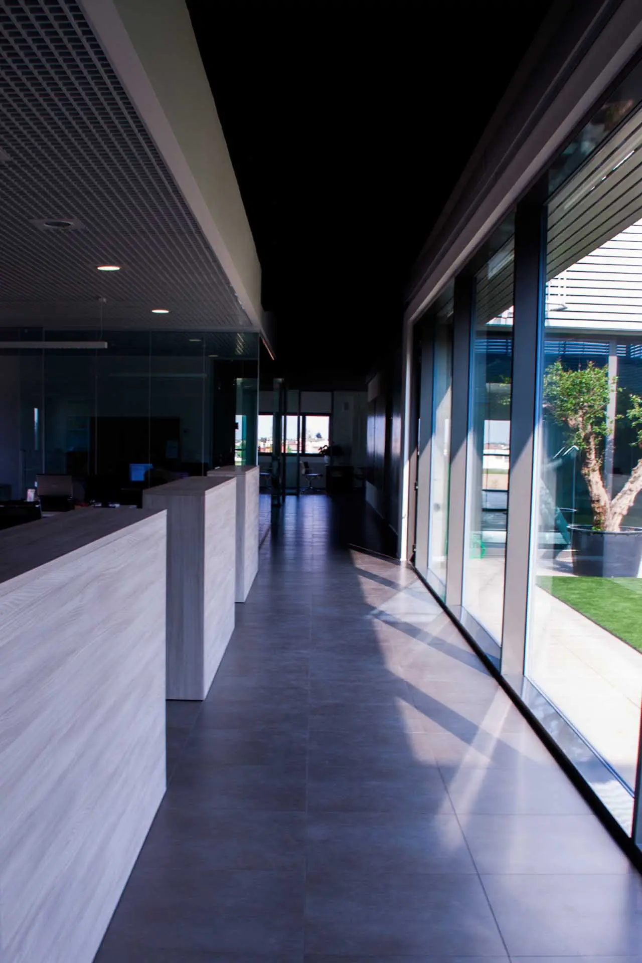 Il vetro è il vero protagonista: utilizzato come parapetto delle scale, nei piani dei tavoli e nelle pareti divisorie degli uffici, dona trasparenza, leggerezza e un tocco di raffinatezza all’intero progetto.