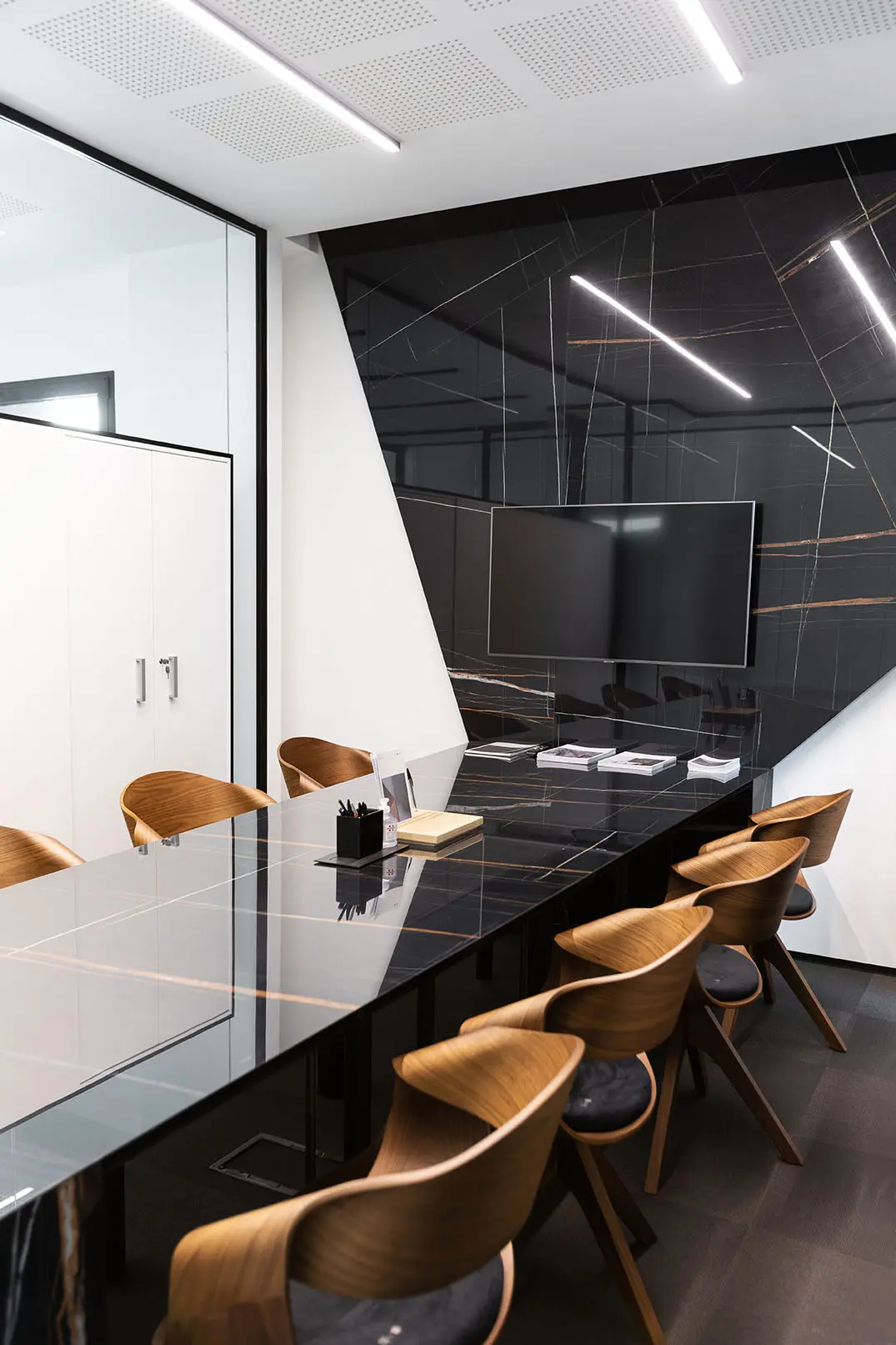 Per sfruttare al massimo gli spazi, abbiamo progettato un mobile “a ponte” su misura, integrato direttamente all’interno della parete vetrata. Oltre a fungere da armadio contenitivo, questo elemento contribuisce a mantenere ordine e linearità visiva, in perfetta sintonia con il resto dell’arredo ufficio.