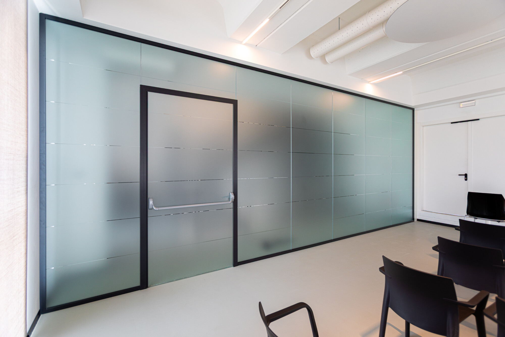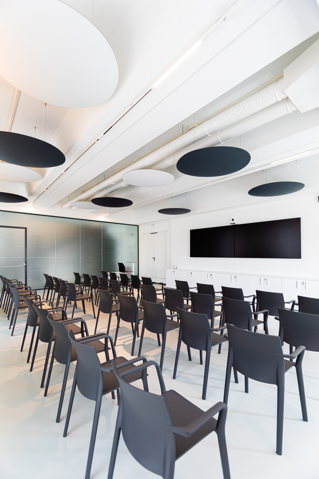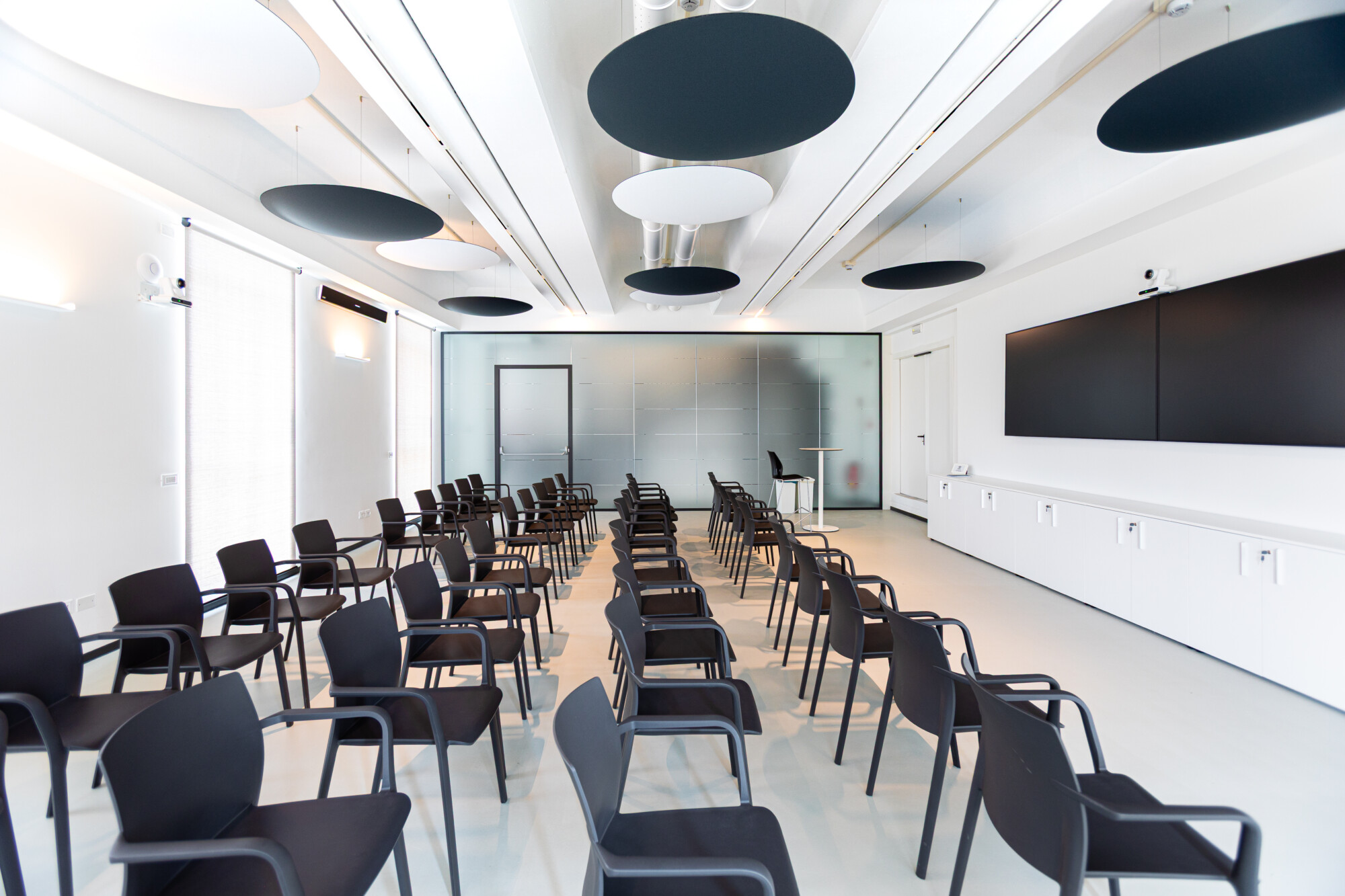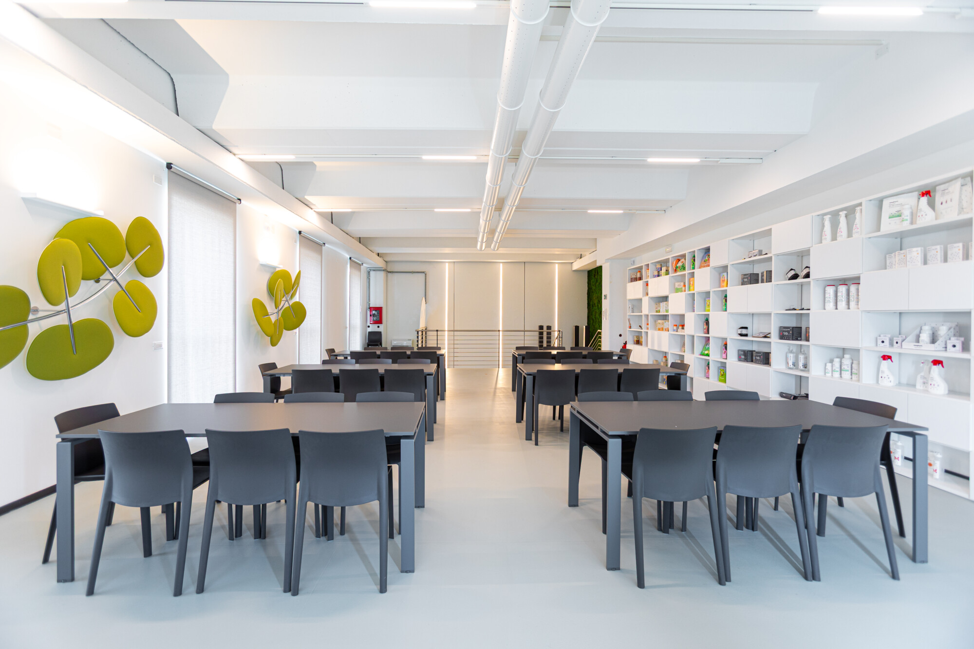 Abbiamo realizzato la sala formazione e installato pareti vetrate e pannelli a soffitto per migliorare comfort acustico e luminosità. I contenitori e armadi sono stati progettati su misura per mantenere l’ambiente ordinato e funzionale, in linea con le esigenze operative del cliente.