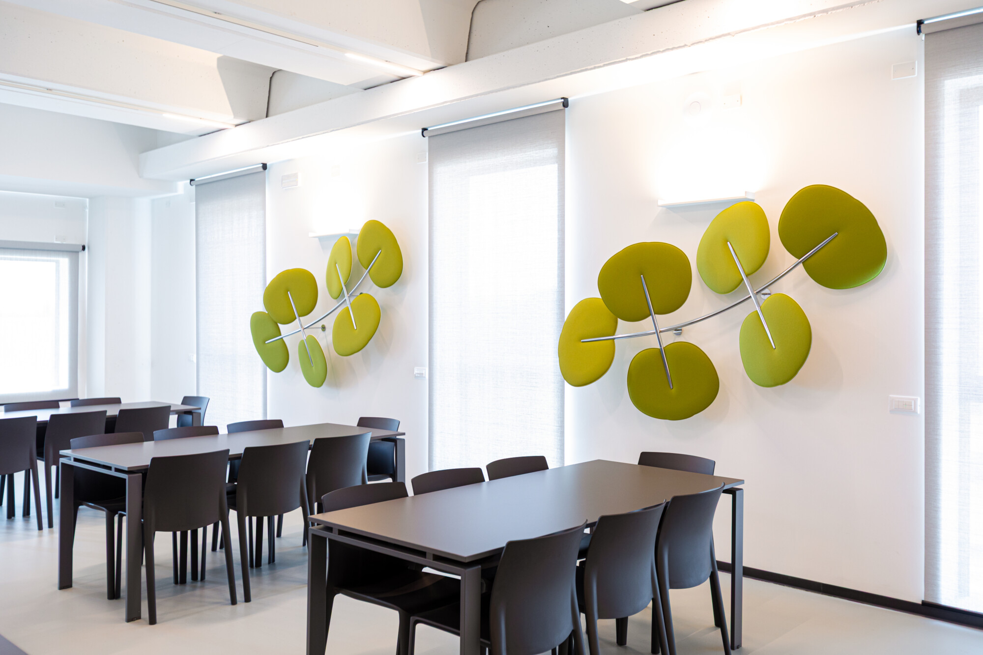 Il progetto si è completato con la fornitura di librerie, tavoli e sedie, oltre ai pannelli fonoassorbenti Botanica Wall-Ceiling firmati da Mario Trimarchi per Caimi, che aggiungono una nota di design naturale e contribuiscono al benessere acustico degli ambienti.