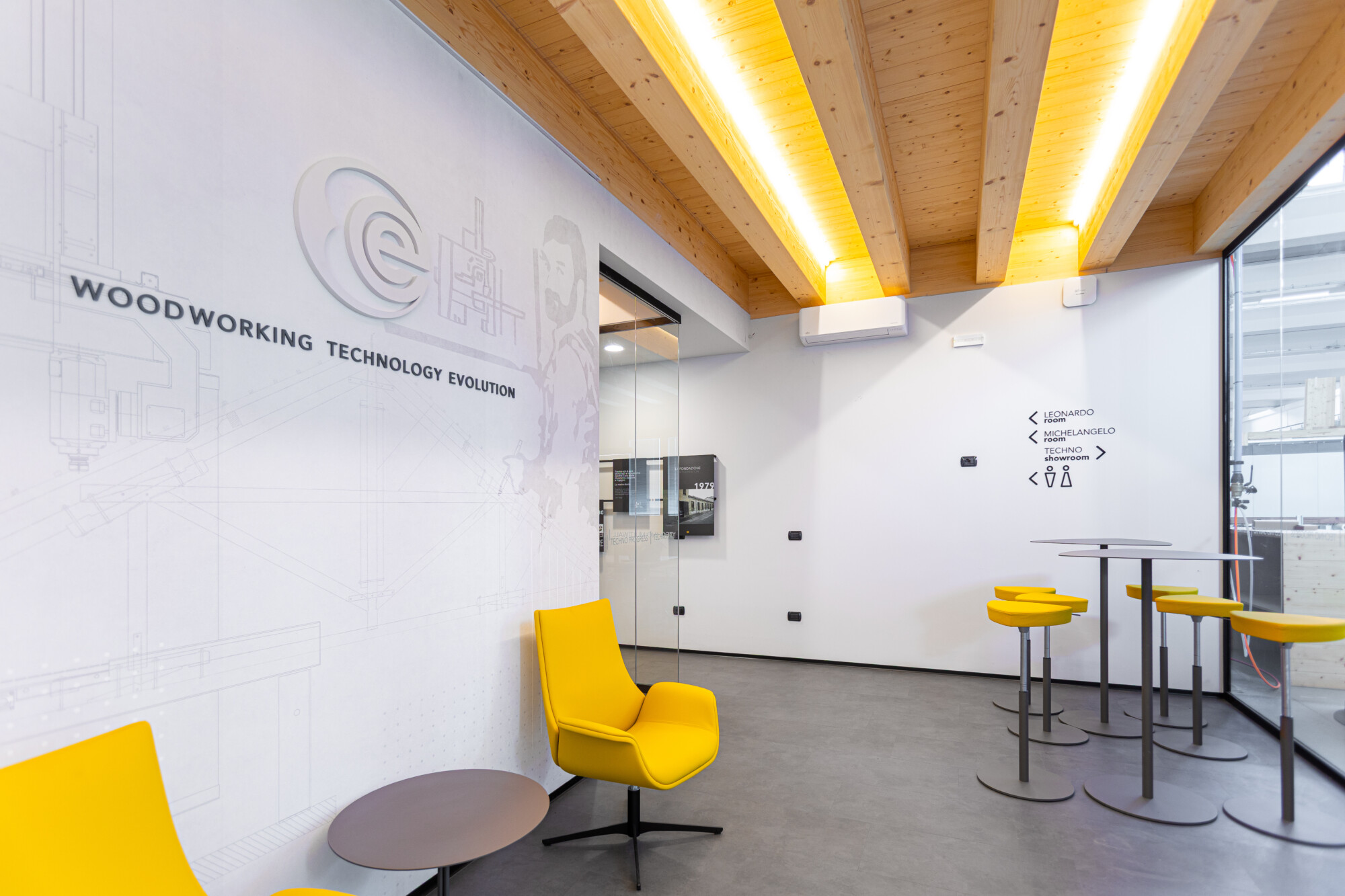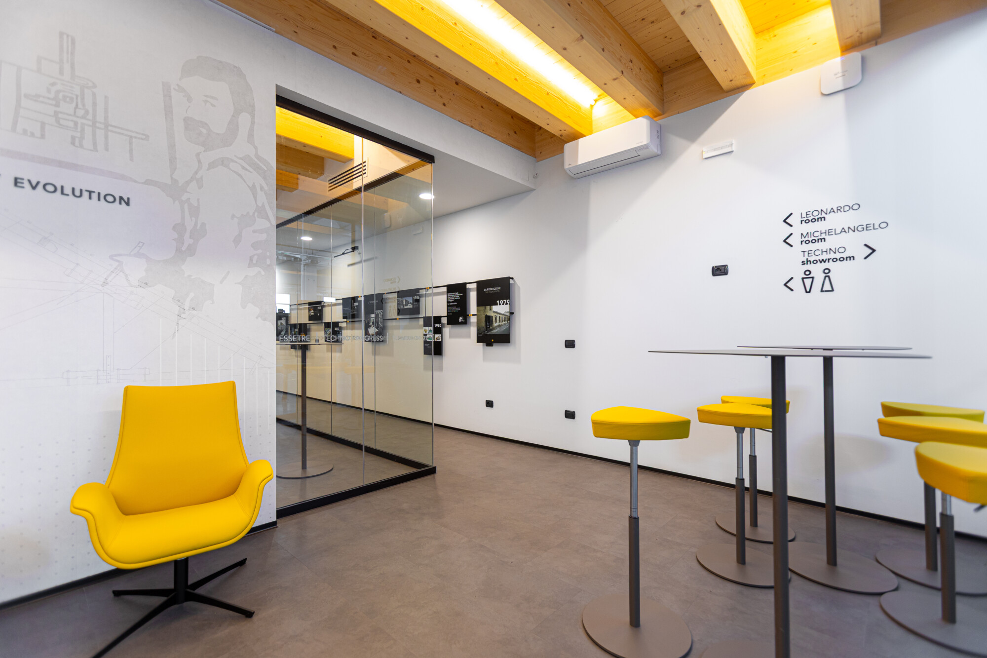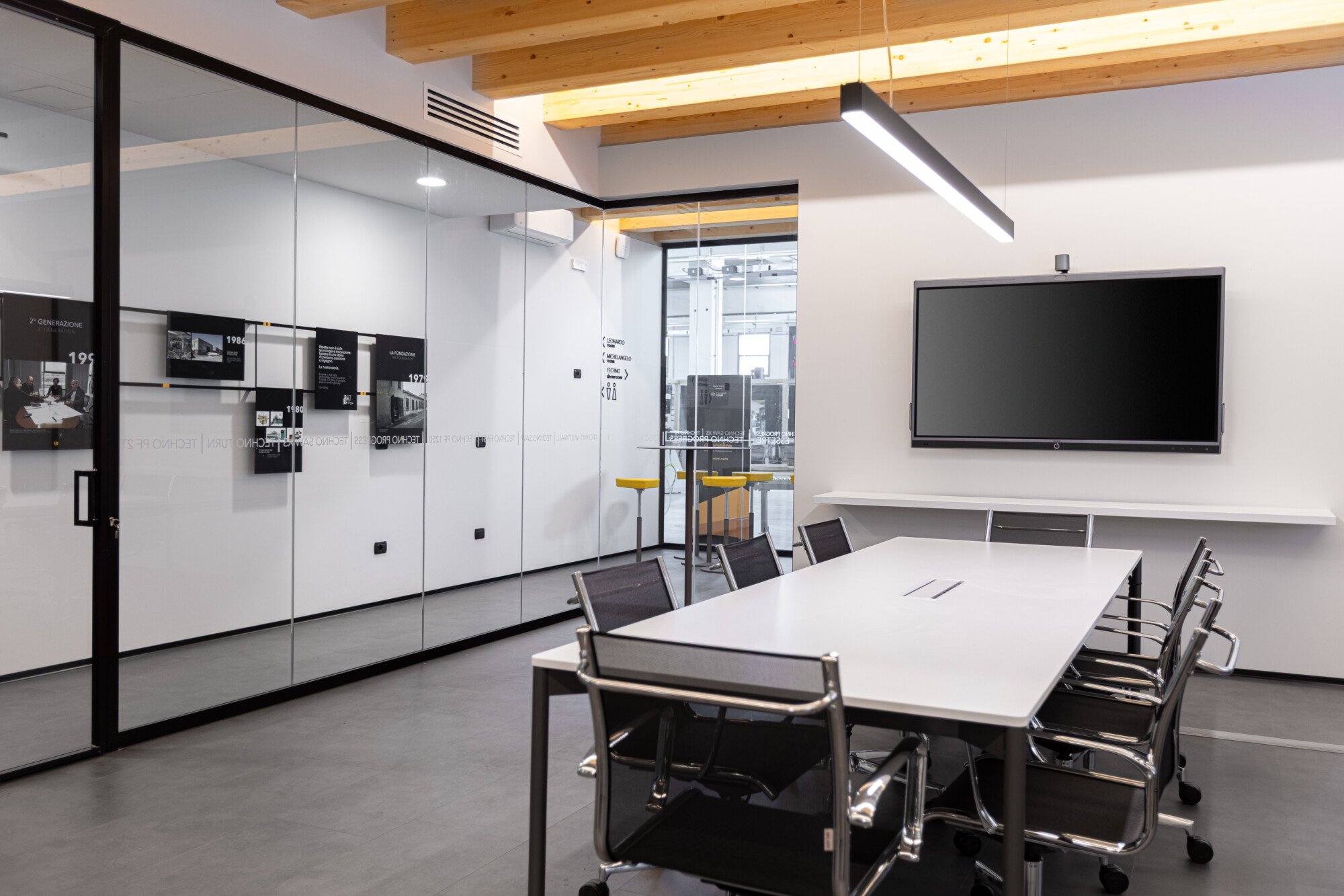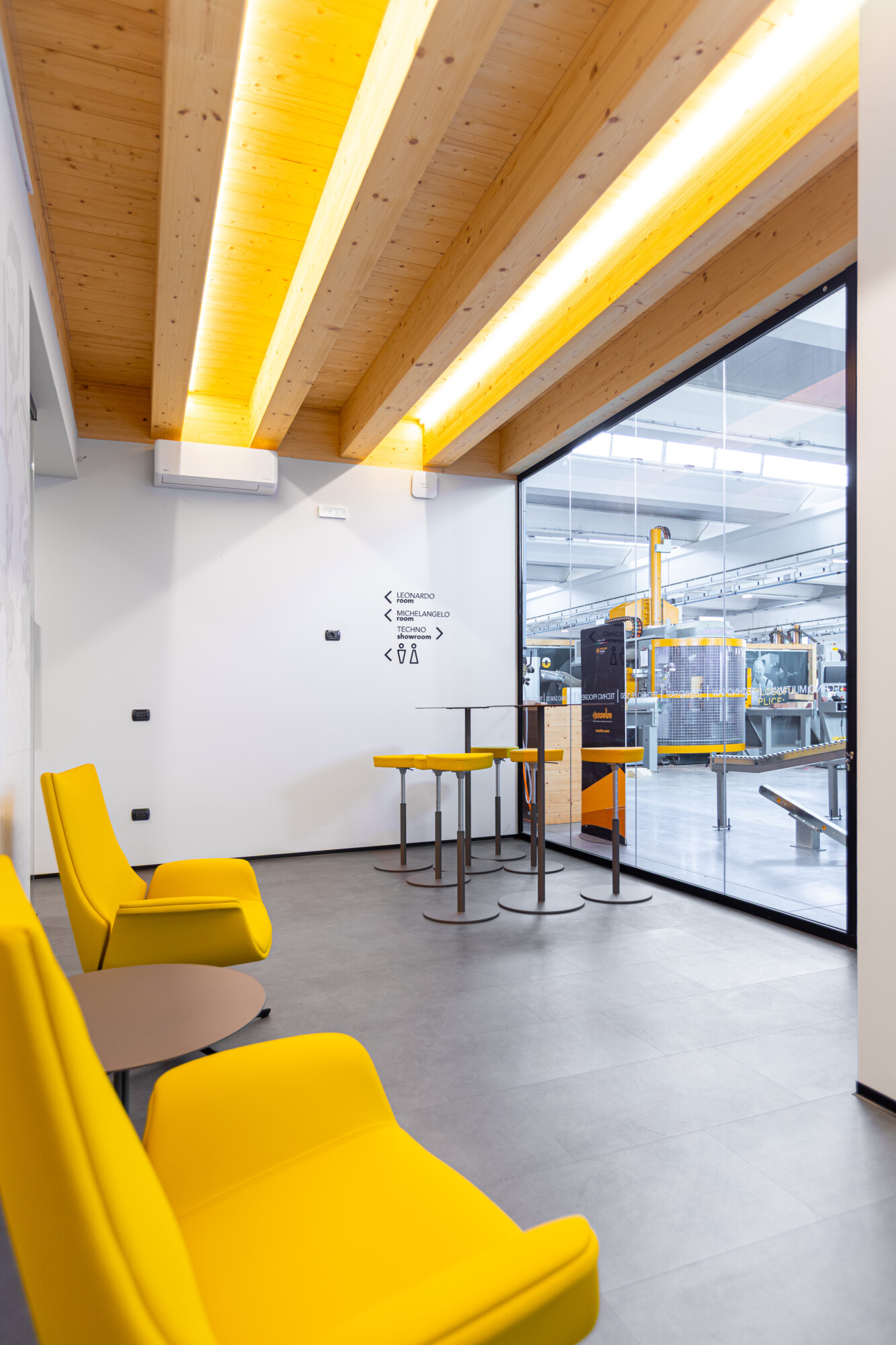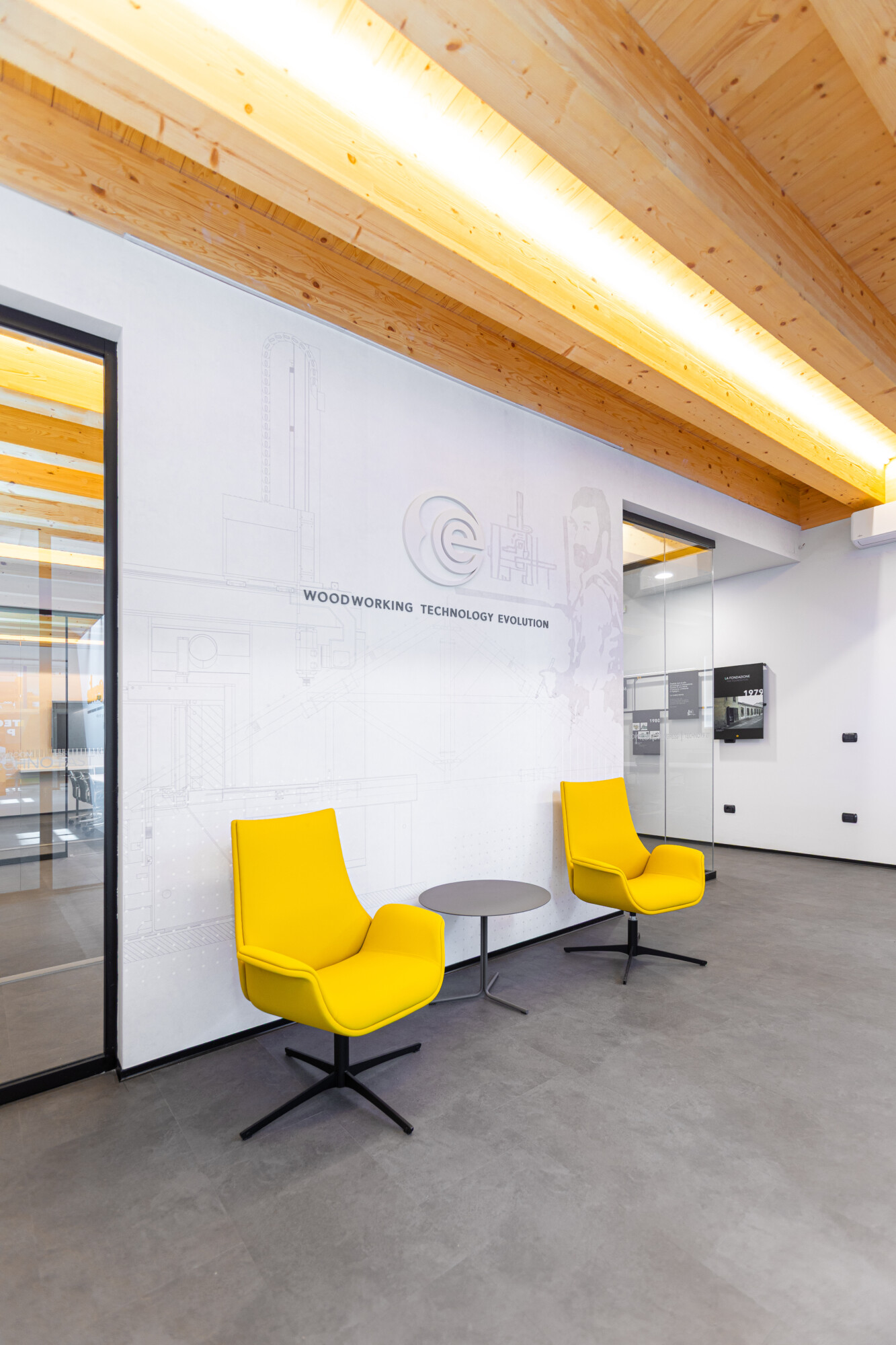 Le pareti in vetro con doppia porta scorrevole lasciano fluire la luce e le idee, creando una continuità visiva tra interno ed esterno che amplifica la sensazione di apertura e dialogo. Il soffitto in legno con illuminazione integrata scalda l’ambiente, mentre ogni elemento d’arredo — dalle sedute operative alle poltroncine giallo vivo dell’area relax, fino ai tavoli meeting e alle madie — è stato selezionato per definire uno spazio ordinato, essenziale e accogliente.