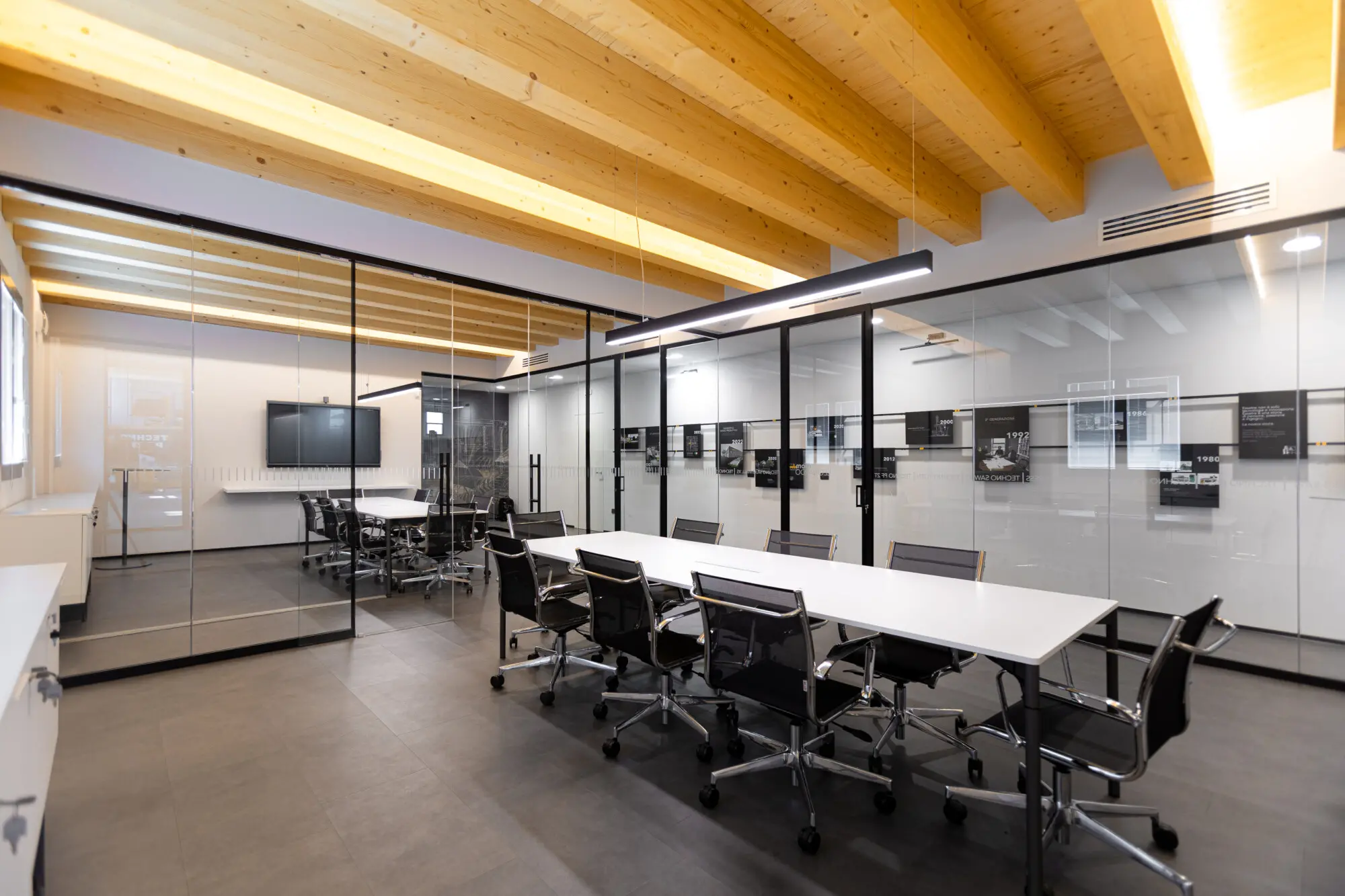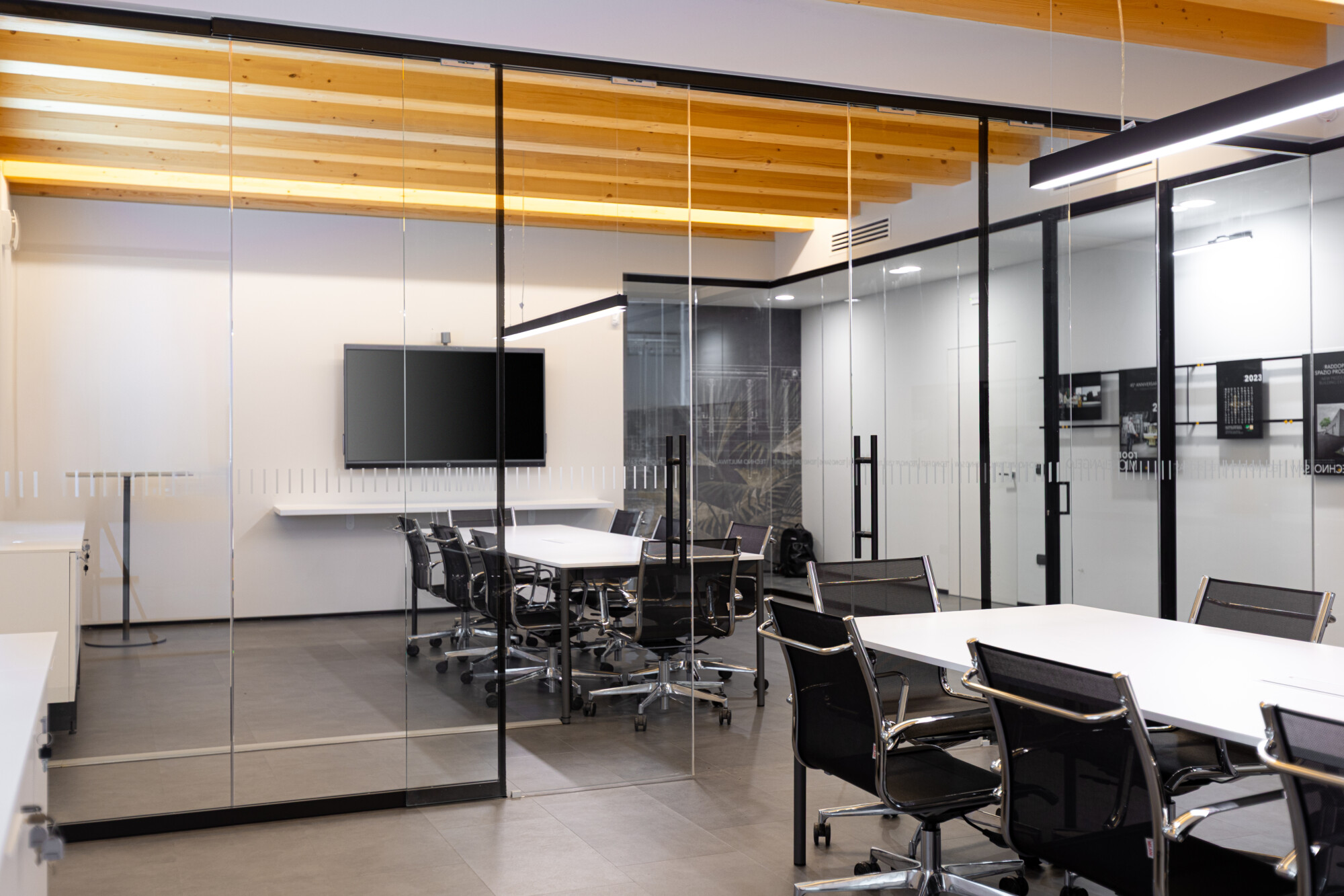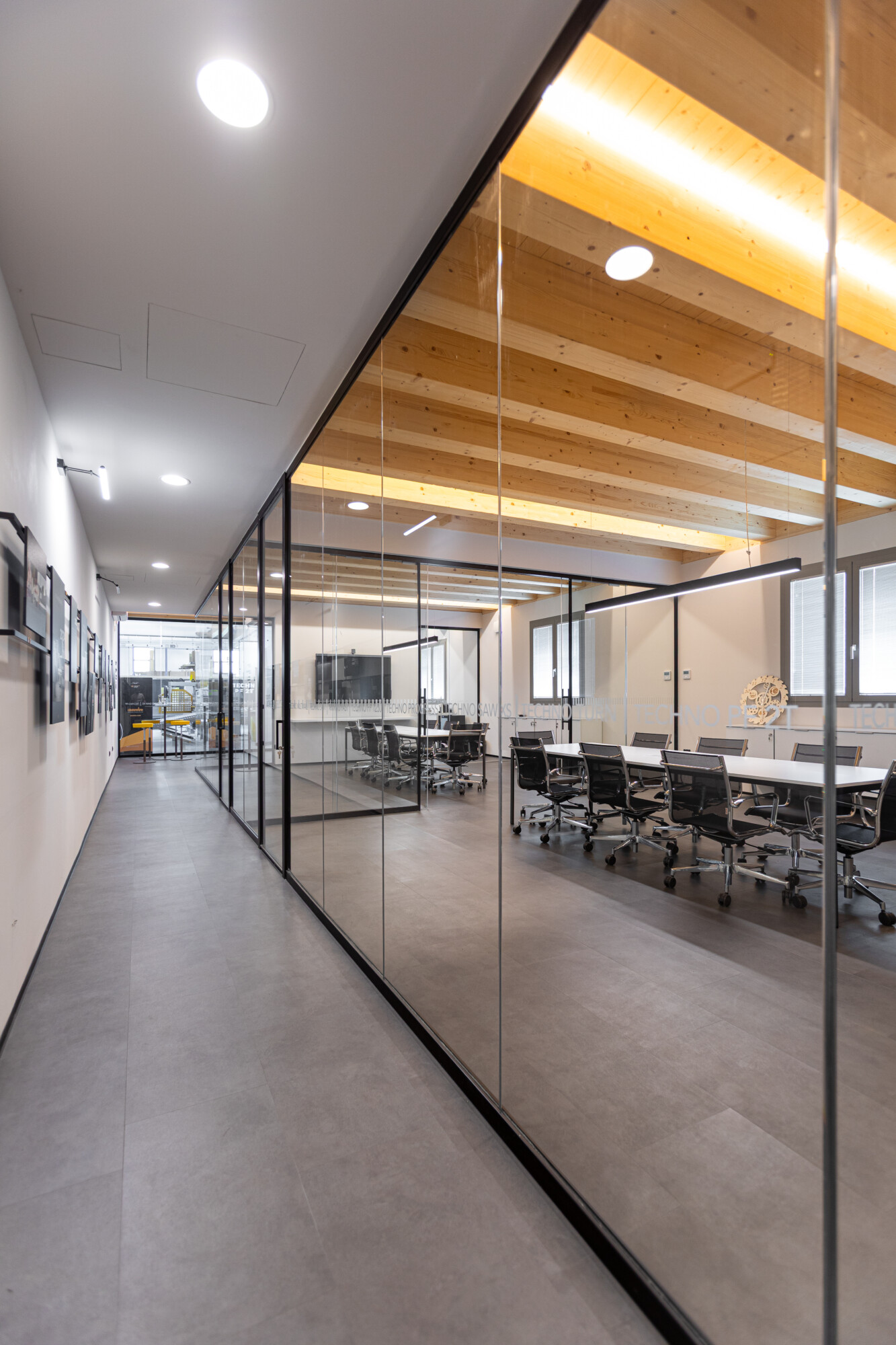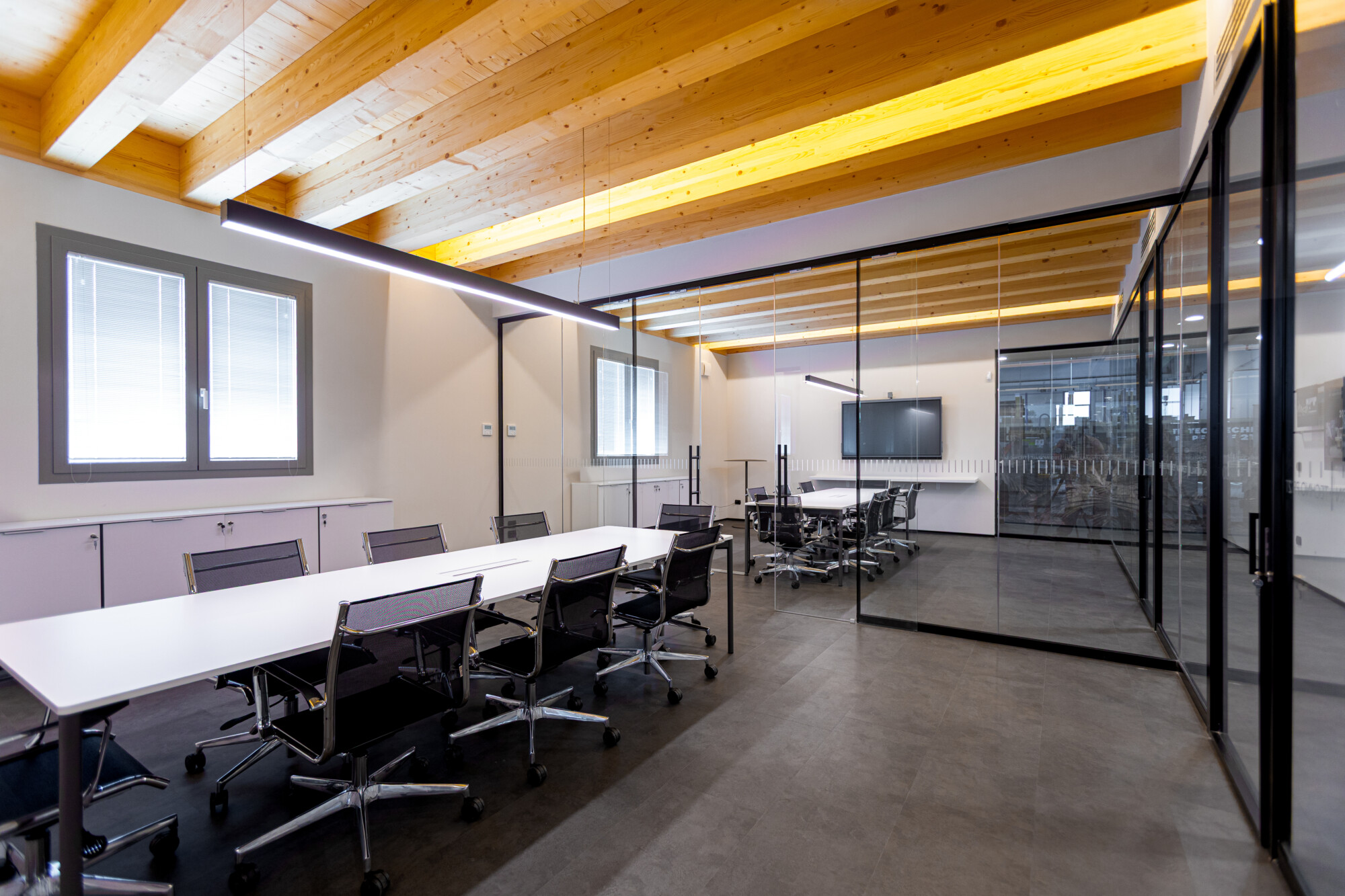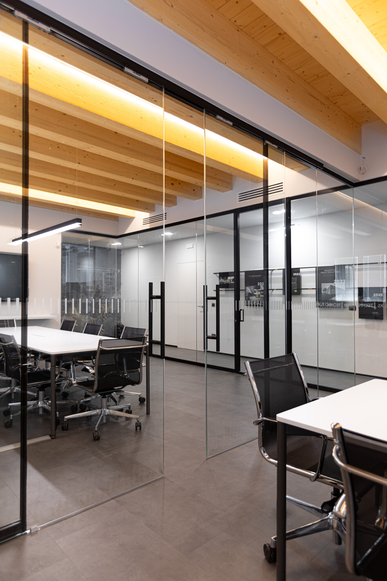 Le pareti in vetro con doppia porta scorrevole lasciano fluire la luce e le idee, creando una continuità visiva tra interno ed esterno che amplifica la sensazione di apertura e dialogo. Il soffitto in legno con illuminazione integrata scalda l’ambiente, mentre ogni elemento d’arredo — dalle sedute operative alle poltroncine giallo vivo dell’area relax, fino ai tavoli meeting e alle madie — è stato selezionato per definire uno spazio ordinato, essenziale e accogliente.