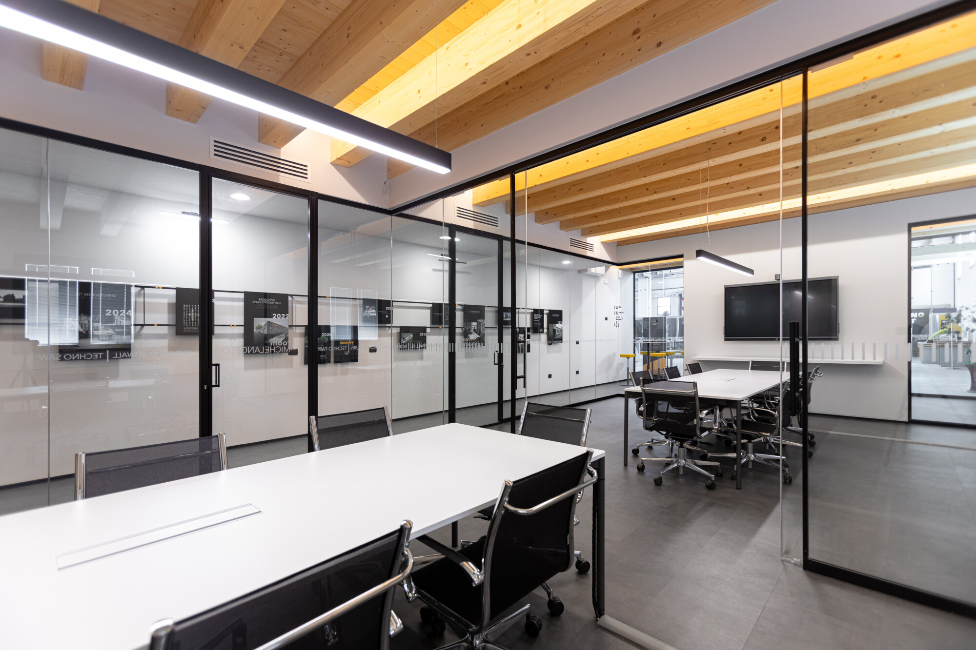 Gli spazi di lavoro di Essetre a Thiene sono stati progettati e realizzati secondo un criterio di trasparenza, funzionalità ed eleganza, dando vita a un ambiente di lavoro che unisce design e operatività quotidiana. Il cuore del progetto è un box completamente vetrato, inserito direttamente all’interno dell’area produttiva, che accoglie le sale meeting e una piccola ma raffinata area break. Una soluzione insolita e distintiva, capace di trasformare uno spazio tecnico in un luogo dedicato al confronto e alle relazioni.