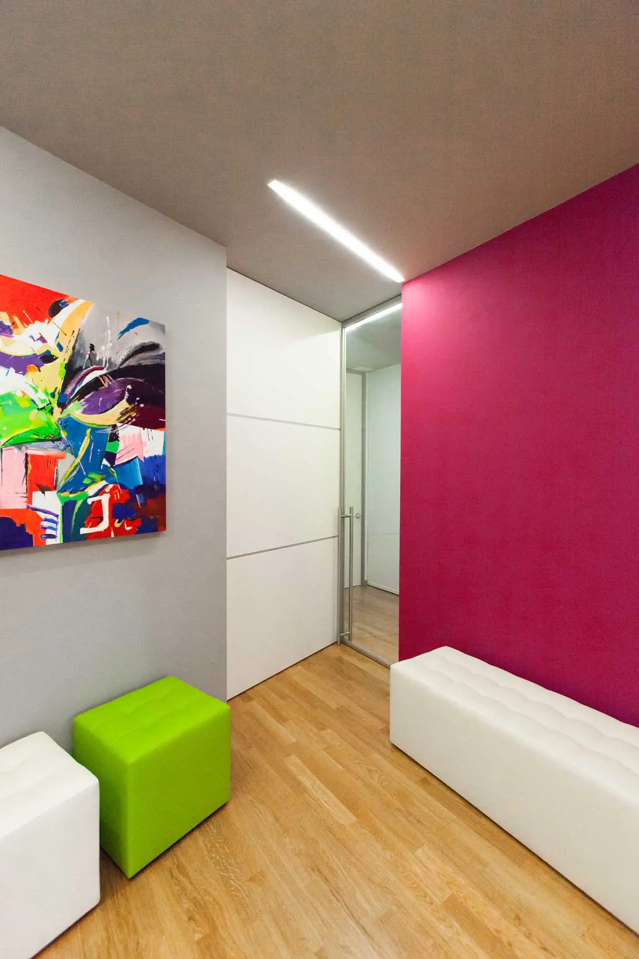 The archive cabinets are hidden by sliding doors in glossy back-lacquered glass and form the walls of the central corridor.